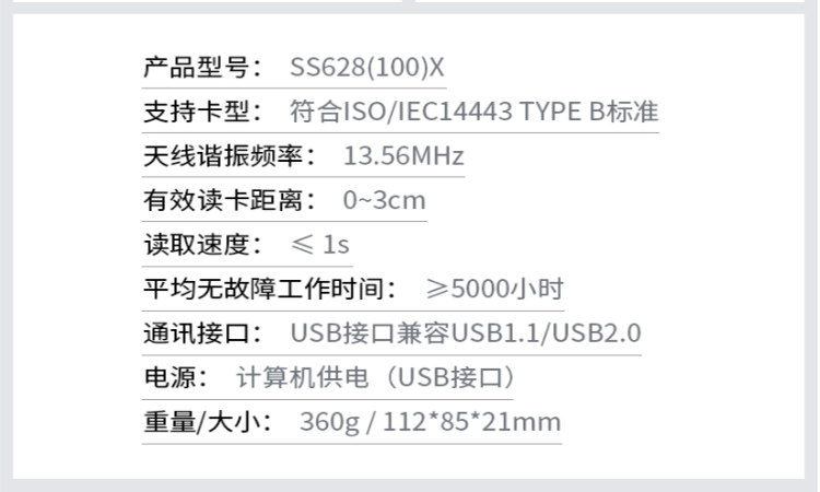 (*由于產(chǎn)品升級(jí)或其他原因,神思SS628-100X身份證閱讀器產(chǎn)品實(shí)際參數(shù)有可能變更,以實(shí)際產(chǎn)品為準(zhǔn)。本文中的所有陳述、信息和建議也不構(gòu)成任何明示或暗示的擔(dān)保)
