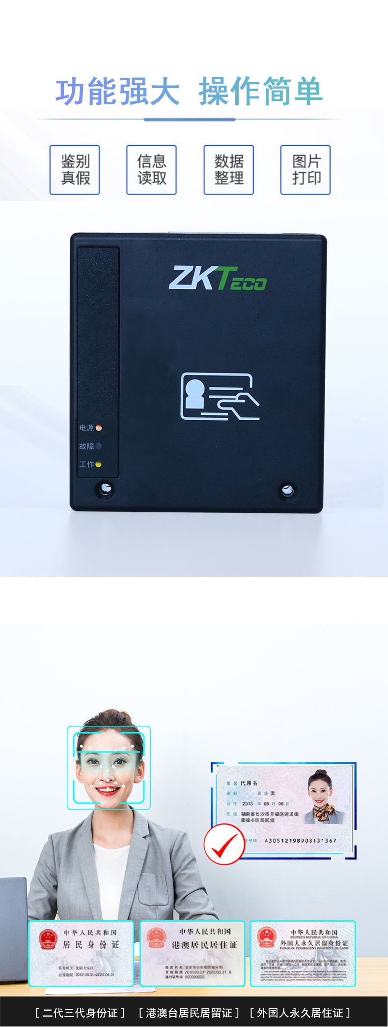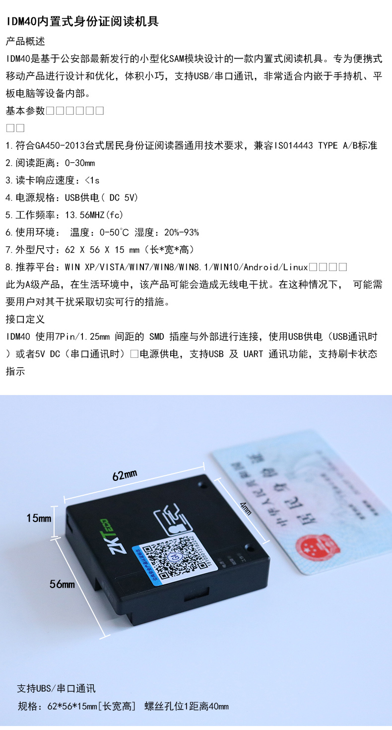 IDM40是一款帶指紋核驗功能的內置式身份證閱讀機具,內置身份證閱讀機具IDM40是中控熵基科技推出的一款帶指紋核驗功能的內置式身份證閱讀機具。內置身份證專用解碼模塊(SAM)和高性能半導體身份證指紋采集器,可現(xiàn)場采集持證人的指紋信息并通過專用的身份證指紋應用算法進行“人證合一”驗證,可讀取二代身份證、港澳臺居民居住證信息和外國人永久居留身份證全部信息。采用嵌入式產品設計,外觀小巧,結構緊湊,USB 接口供電、通訊,可提供各類 SDK 和身份證專用指紋應用算法,方便集成到各種平板、手持機等移動設備內部以實現(xiàn)人證核驗功能